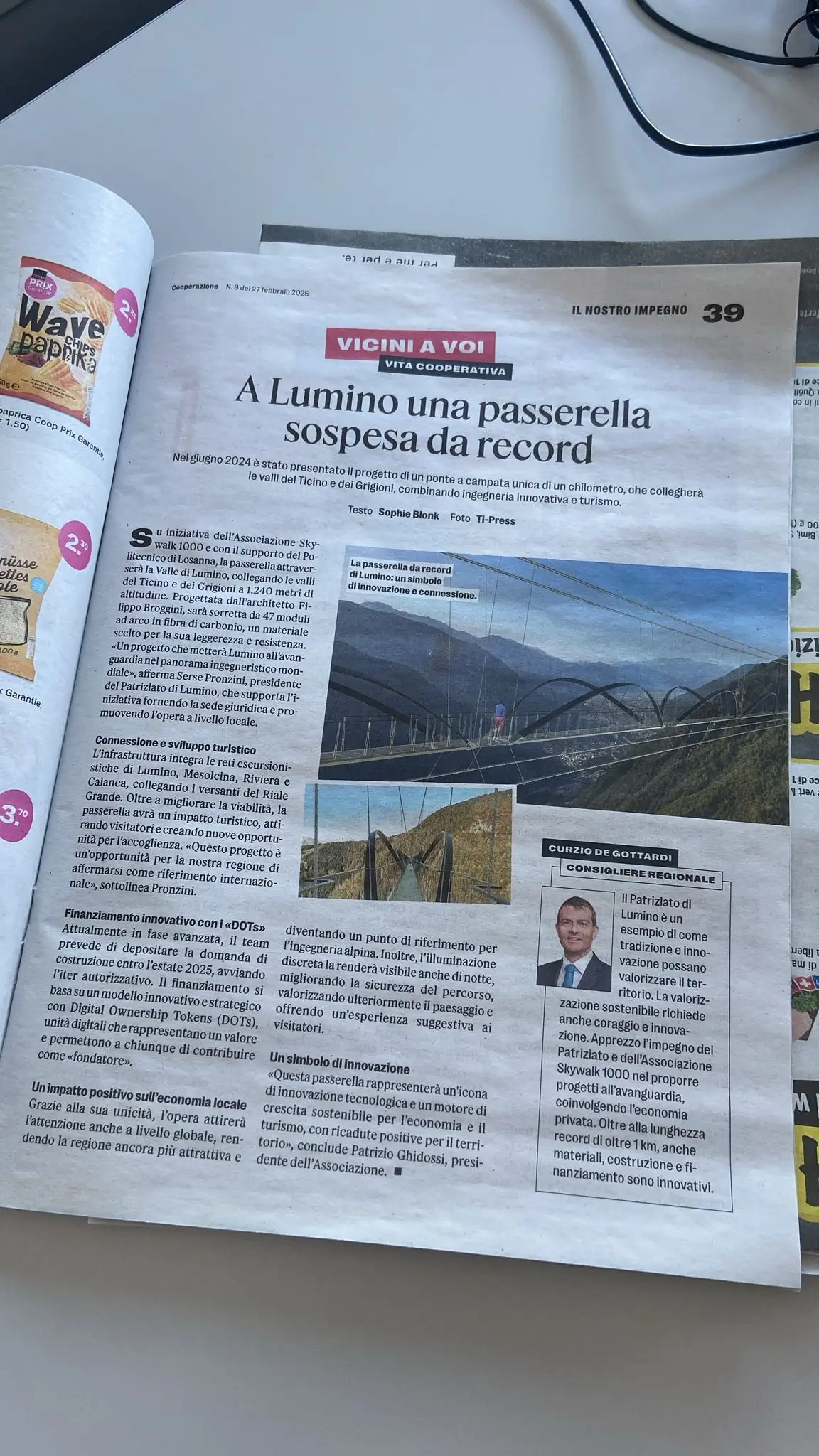 Vi informiamo di un’interessante notizia apparsa oggi su Vita Cooperativa riguardante la passerella sospesa da record prevista a Lumino, un’iniziativa promossa dall’Associazione Skywalk 1000. Questo progetto, che collegherà le valli del Ticino e dei Grigioni con una struttura innovativa lunga un chilometro, rappresenta una potenziale opportunità per valorizzare il nostro territorio.